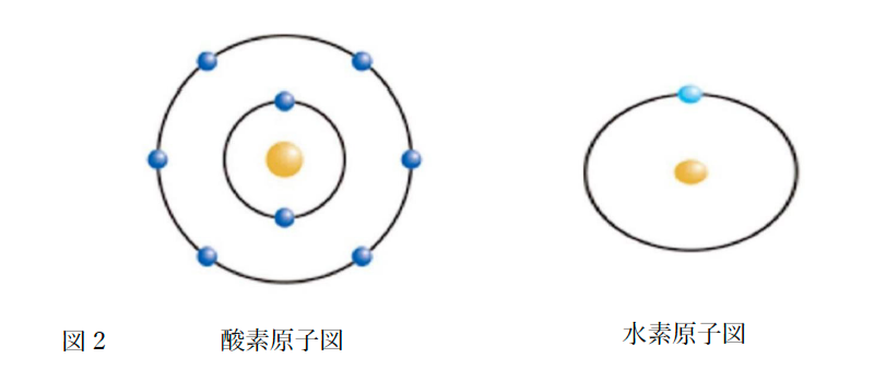 酸素原子には8個の電子があり、水素原子には1個の電子があり原子核の周りを高速で周遊している。