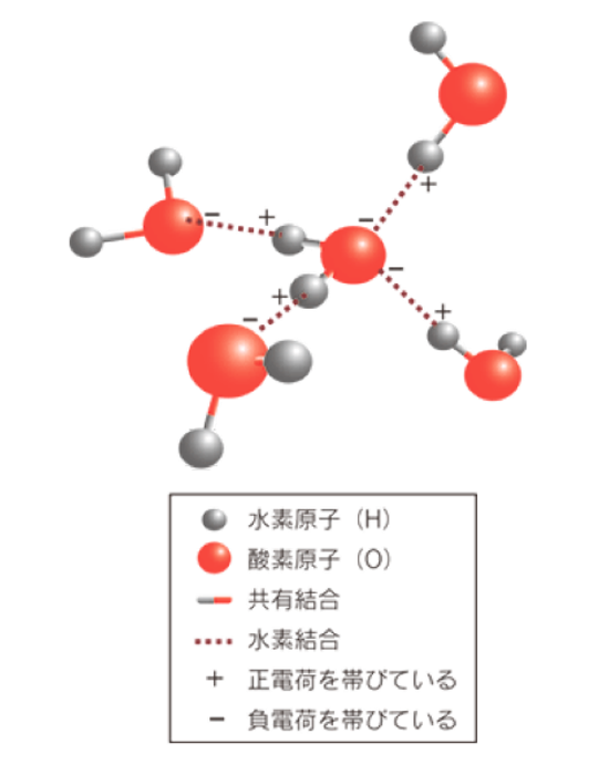 水は酸素原子と水素原子が(図1)の様な形状で結合し水の形状を保持しているが酸素原子と水素原子が共有結合し、更に水分子同士が水素結合で結合し水の結合体を形成