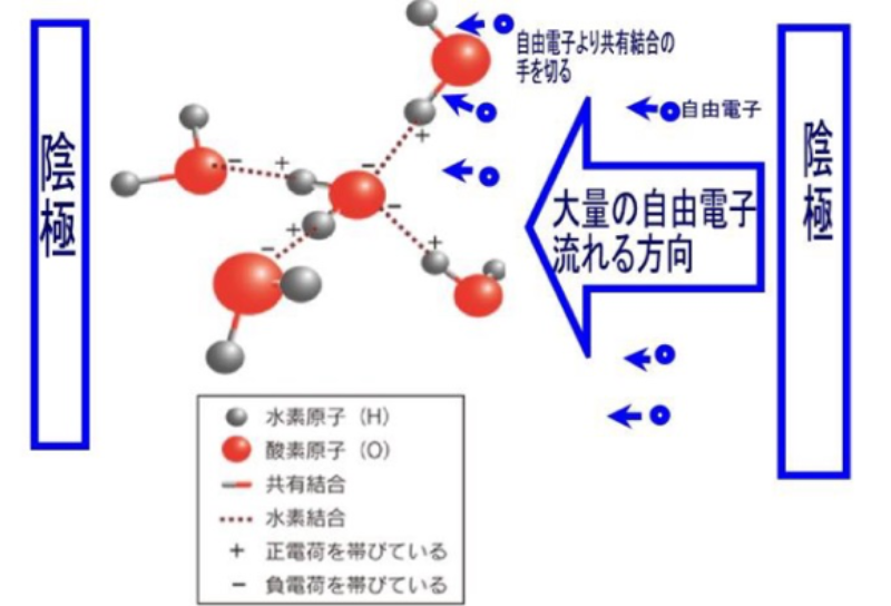 水分子が電気分解し自由電子により酸素原子と水素原子の共有結合体が切られ酸素原子イオン、水素原子イオンと成る。